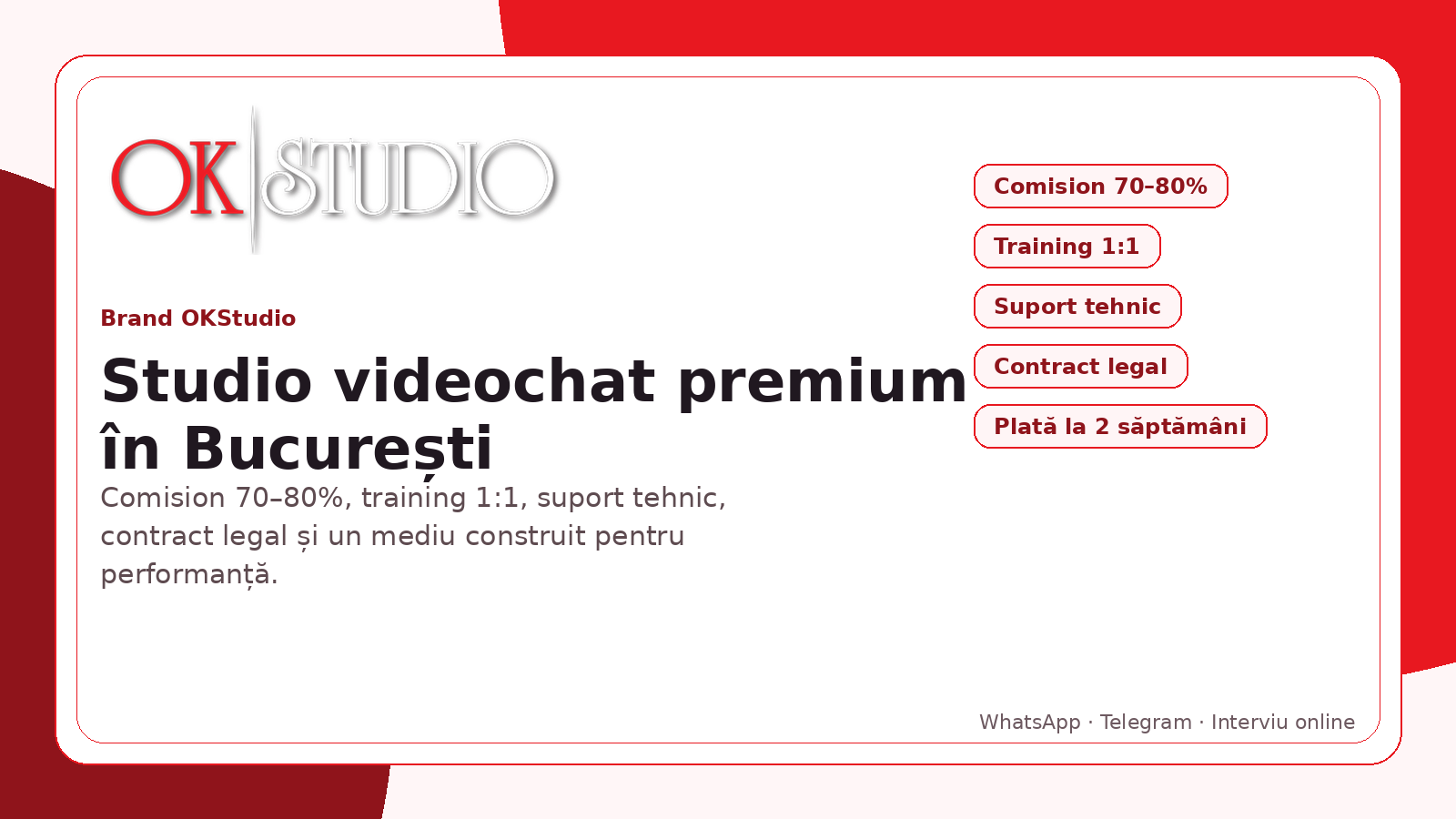 Diferența este în detalii: comision 70–80%, contract legal, transparență, plată la 2 săptămâni și interviu online simplu de programat. Pentru cine caută un studio videochat București sau un studio de videochat profesionist, OKStudio oferă mai mult decât o prezentare frumoasă: oferă structură, îndrumare și suport real.